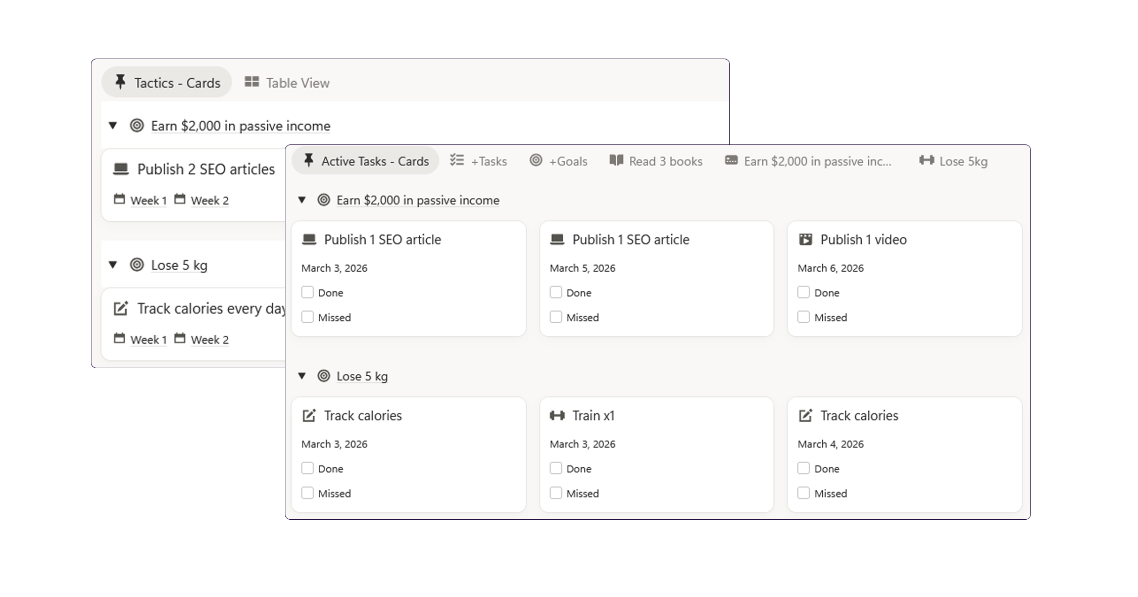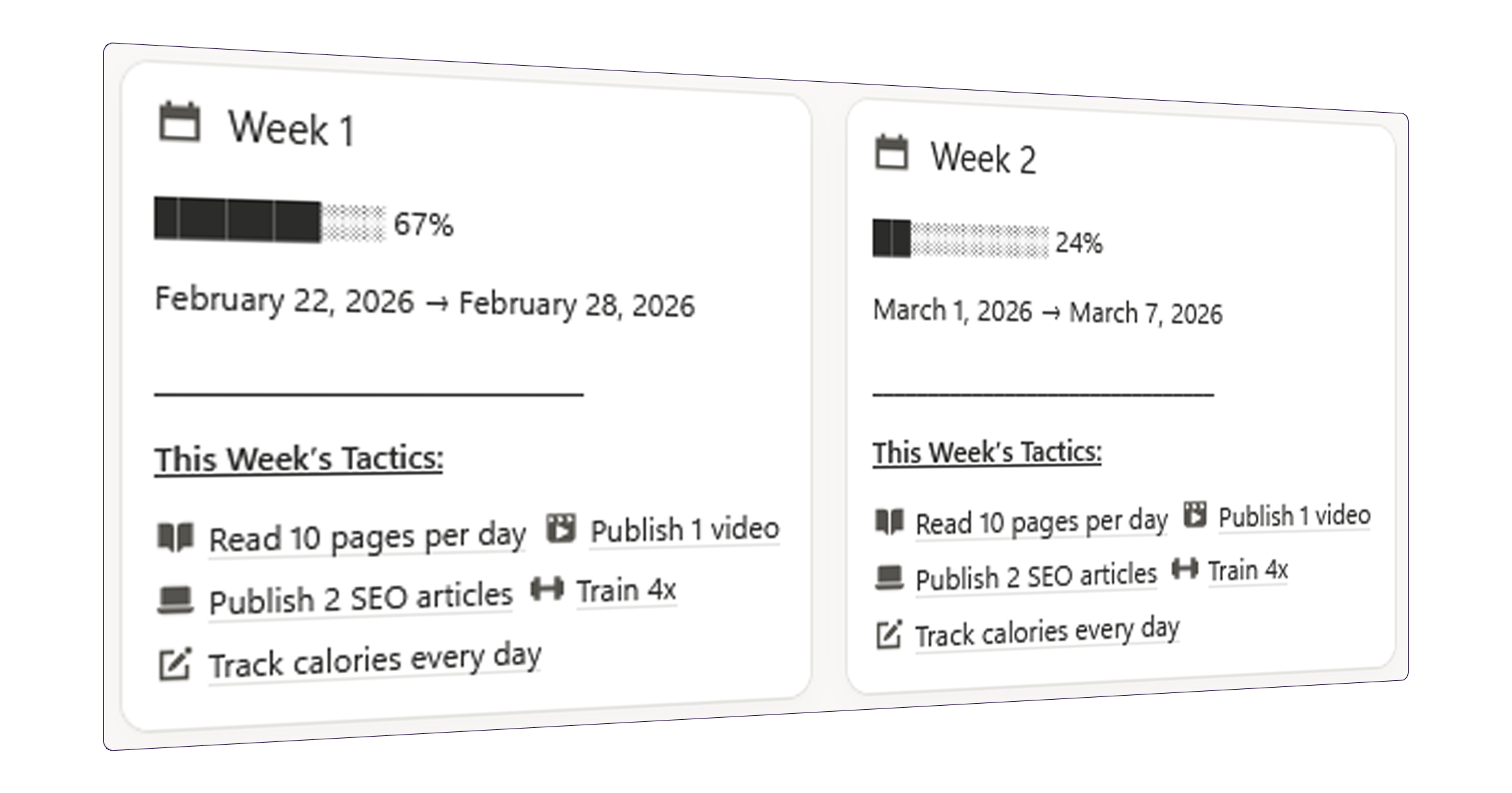 Your goals, tactics, and tasks are fully connected. As you take action, your weekly progress updates automatically.