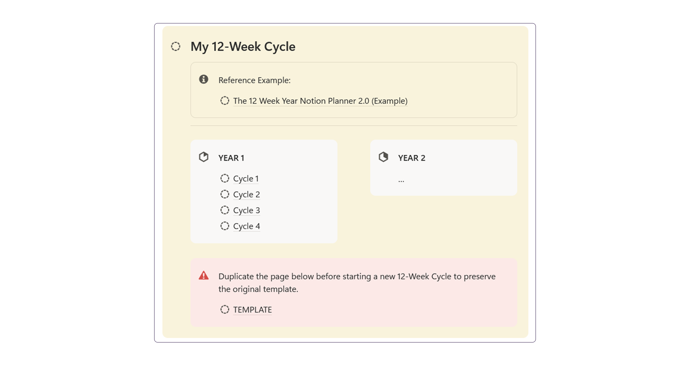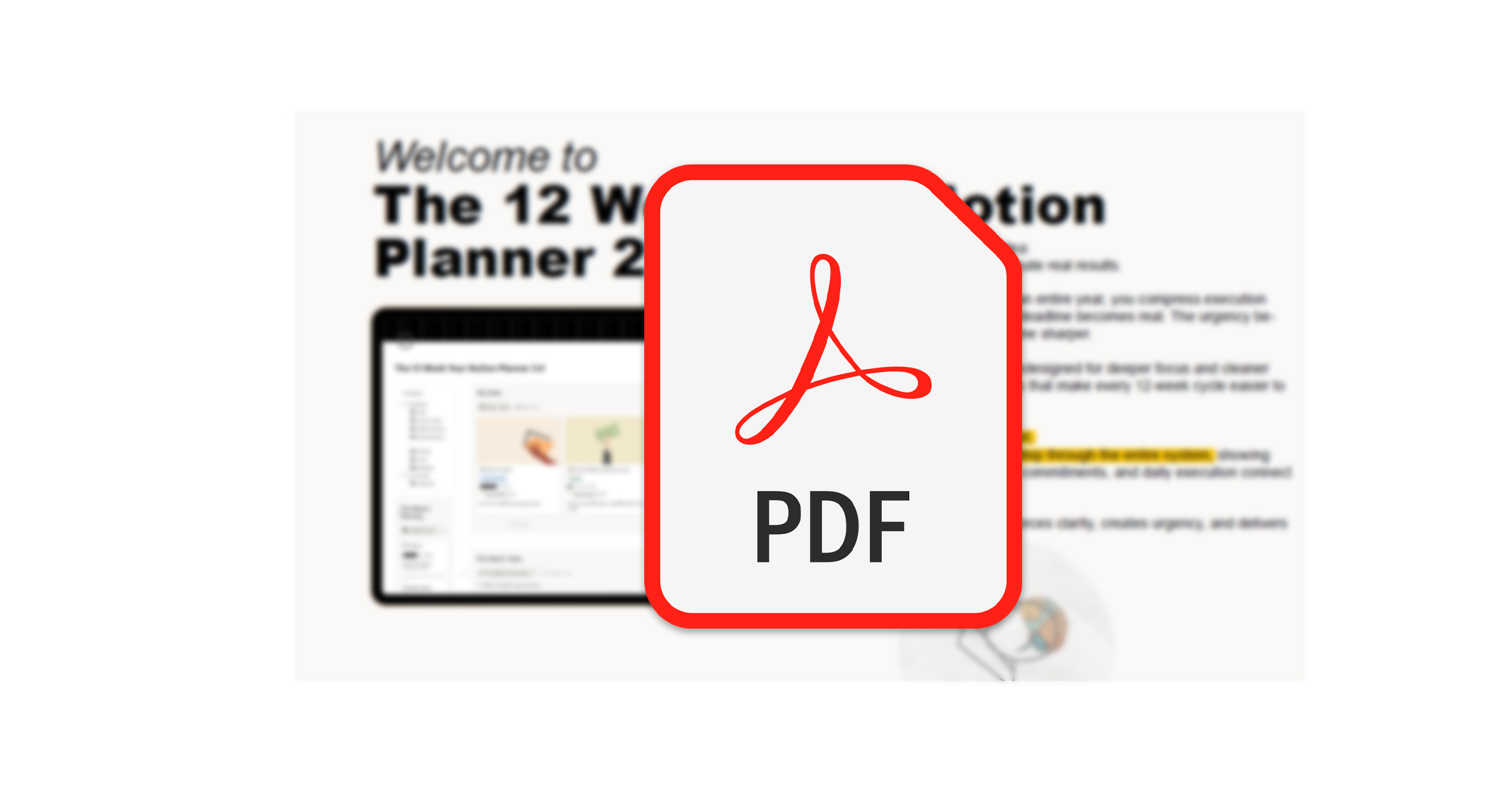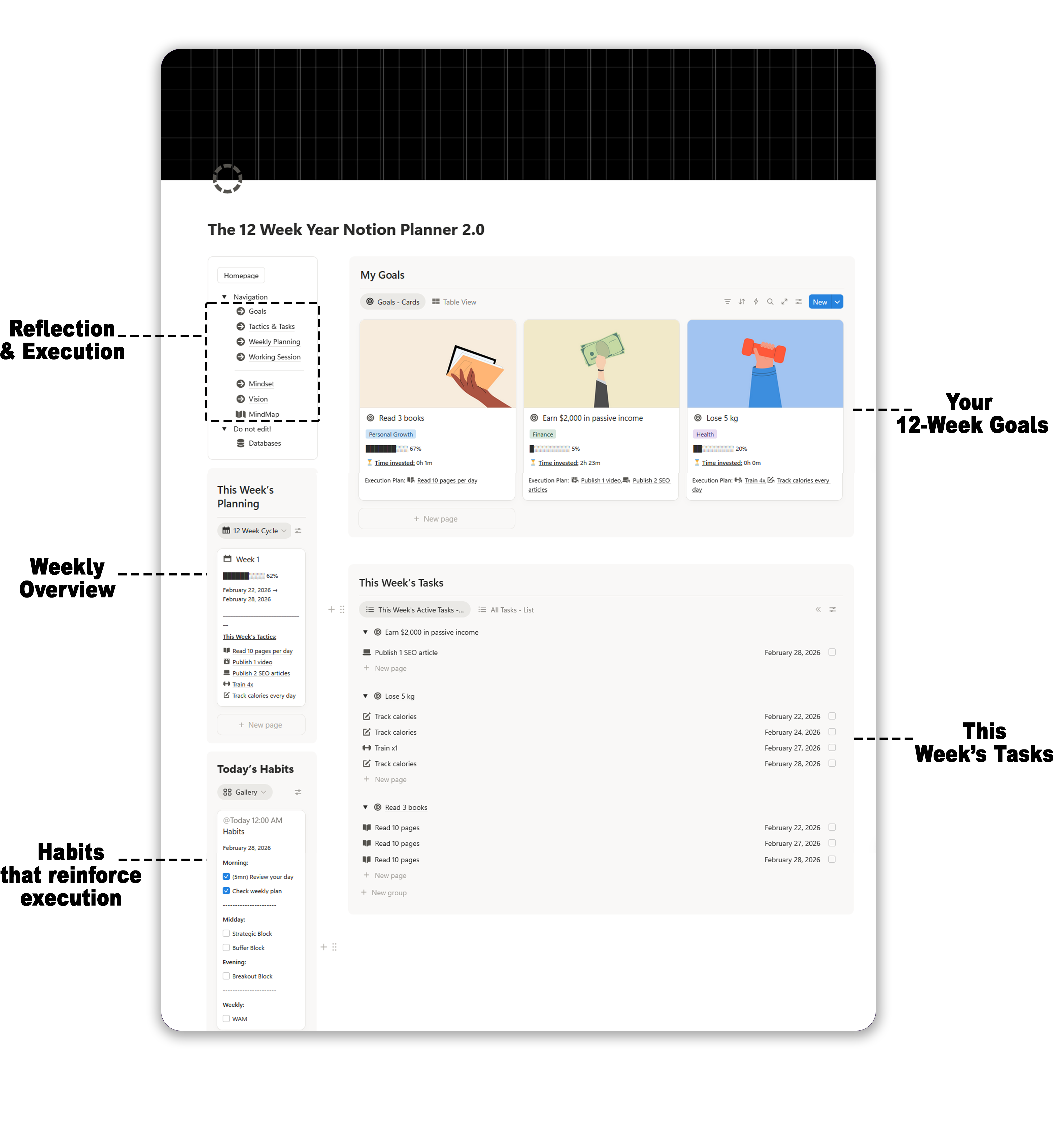The 12 Week Year Notion Planner 2.0 is a Notion-based system designed to help you plan, execute, and track your goals using the powerful principles of The 12-Week Year. It includes goal-setting frameworks, weekly planning tools, progress tracking, and a guided reflection process to help you stay on track.