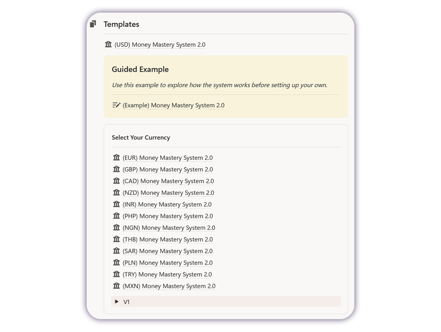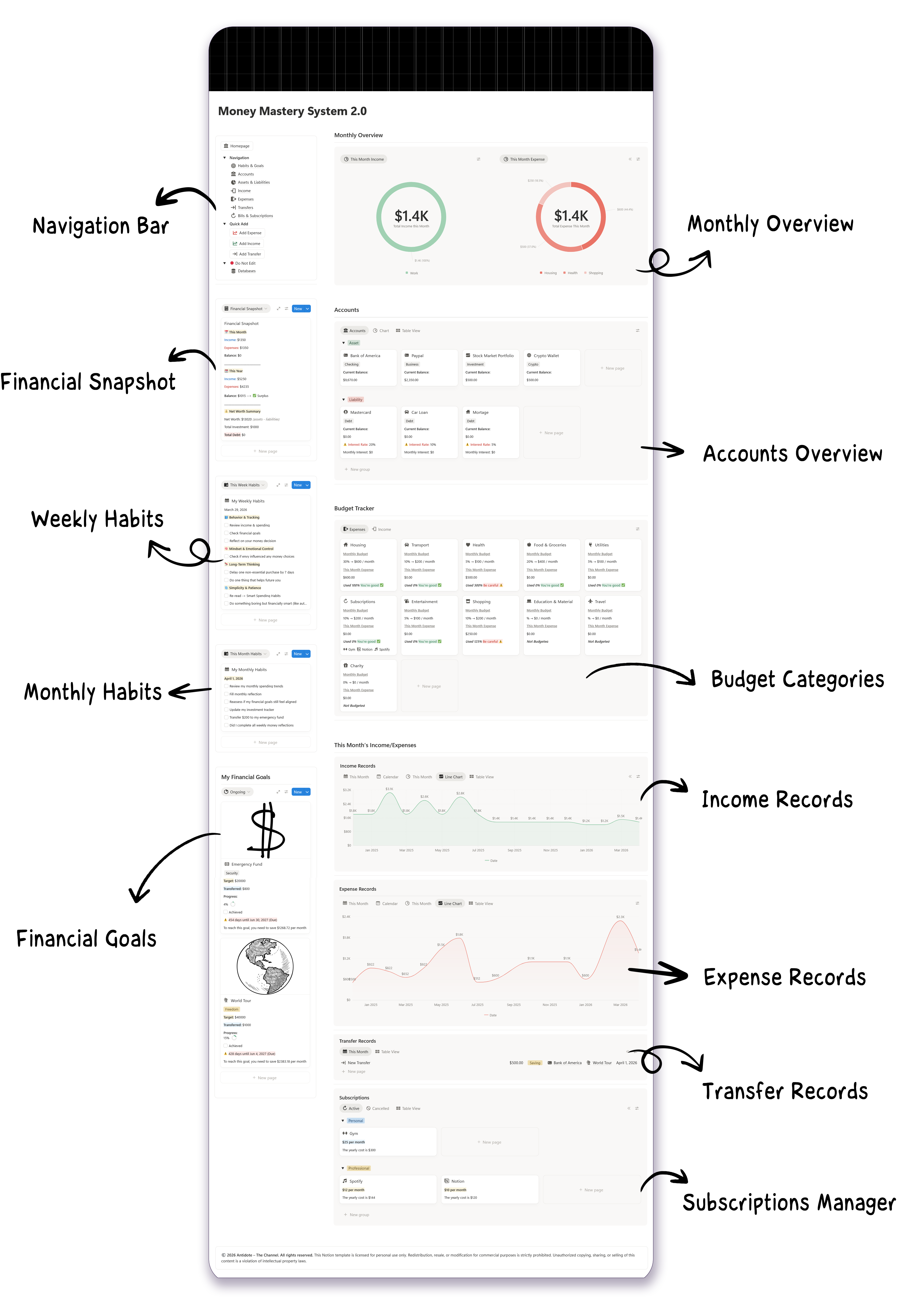 The Money Mastery System is a Notion-based dashboard that helps you manage your finances like the wealthy do. You can track income, expenses, transfers, assets, goals, and even your money mindset, all in one place.