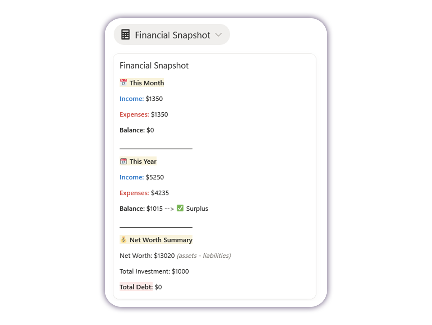 Turn numbers into insights with simple, visual dashboards powered by Notion Charts.* Instantly see your income, expenses, and investments at a glance without digging through tables.