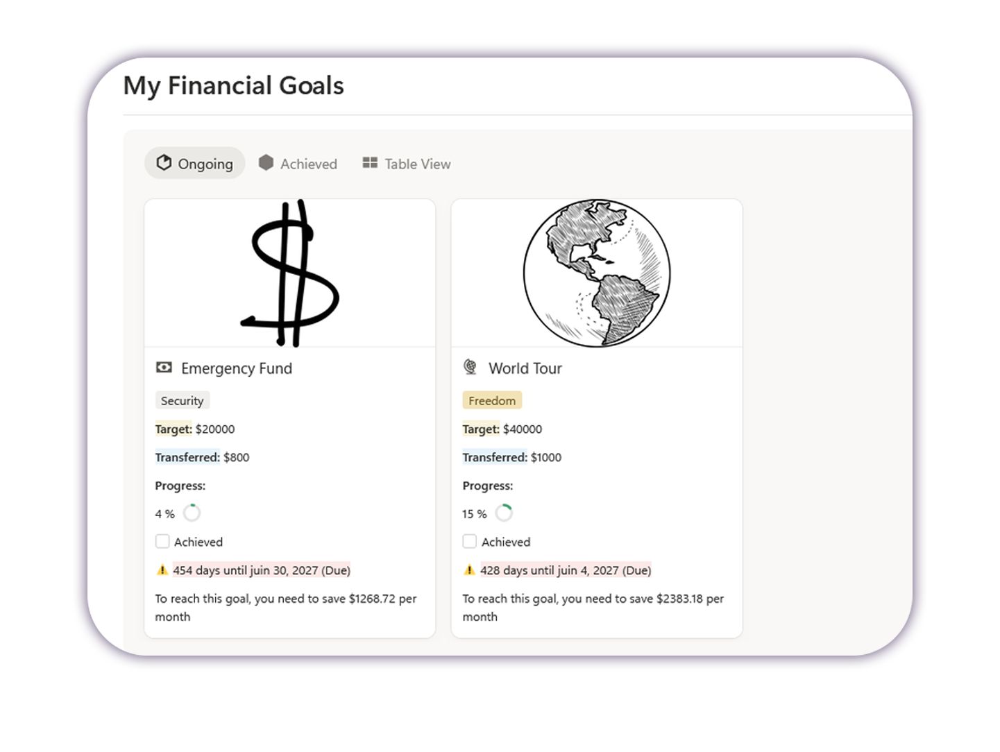 Set clear financial goals and track your progress over time. Whether you’re building an emergency fund or saving for a big milestone, stay focused with countdowns, deadlines, and automatic progress updates.