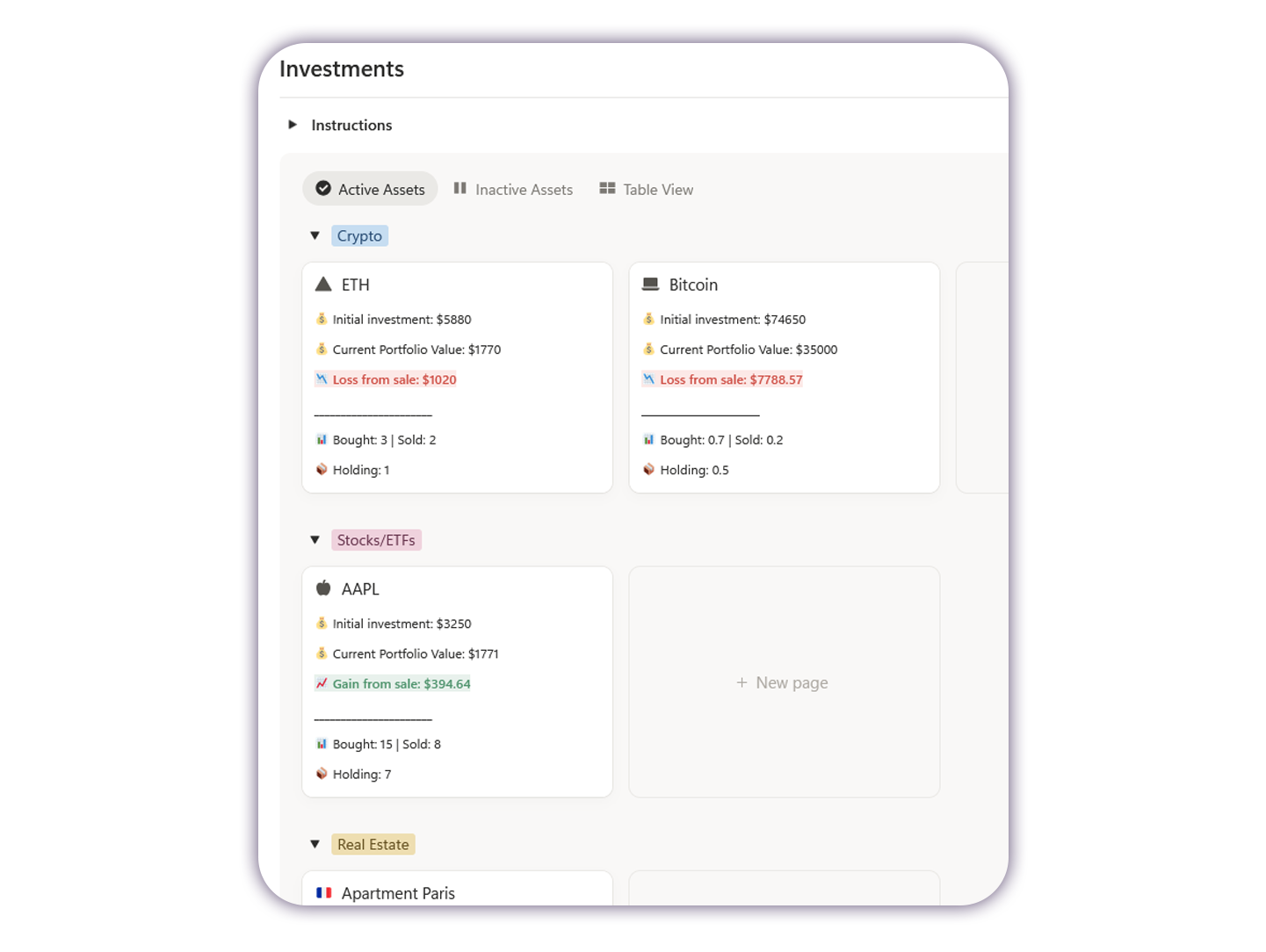 Log every investment you make (from stocks to crypto) and track why you bought, when you sold, and how it performed. See a visual summary of your current portfolio to understand your diversification at a glance.