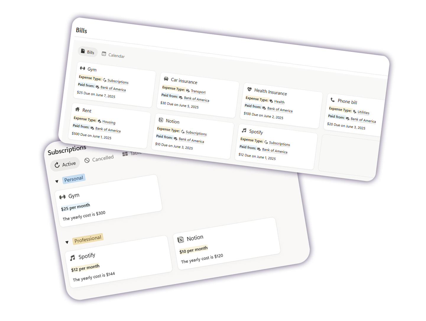 Keep an eye on all your recurring payments: organized and easy to follow. Subscriptions and bills show up in clear cards and monthly calendars, so you never lose track of what’s coming.