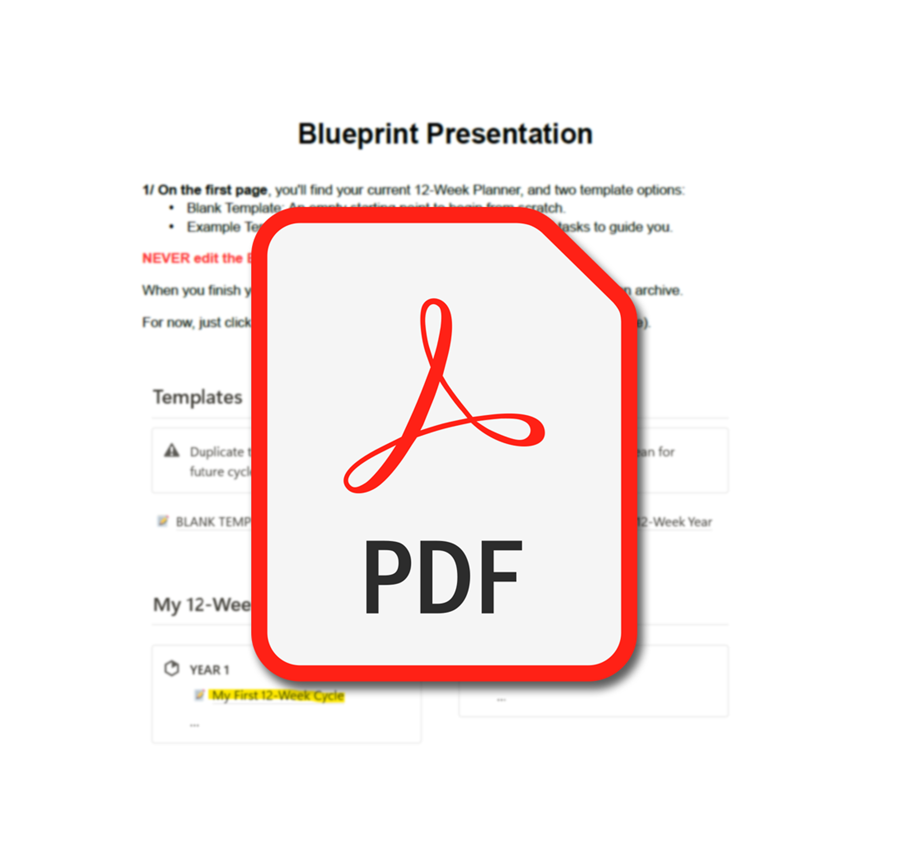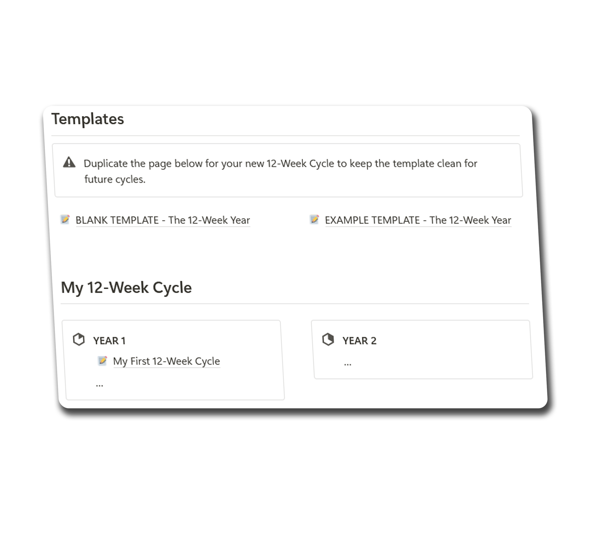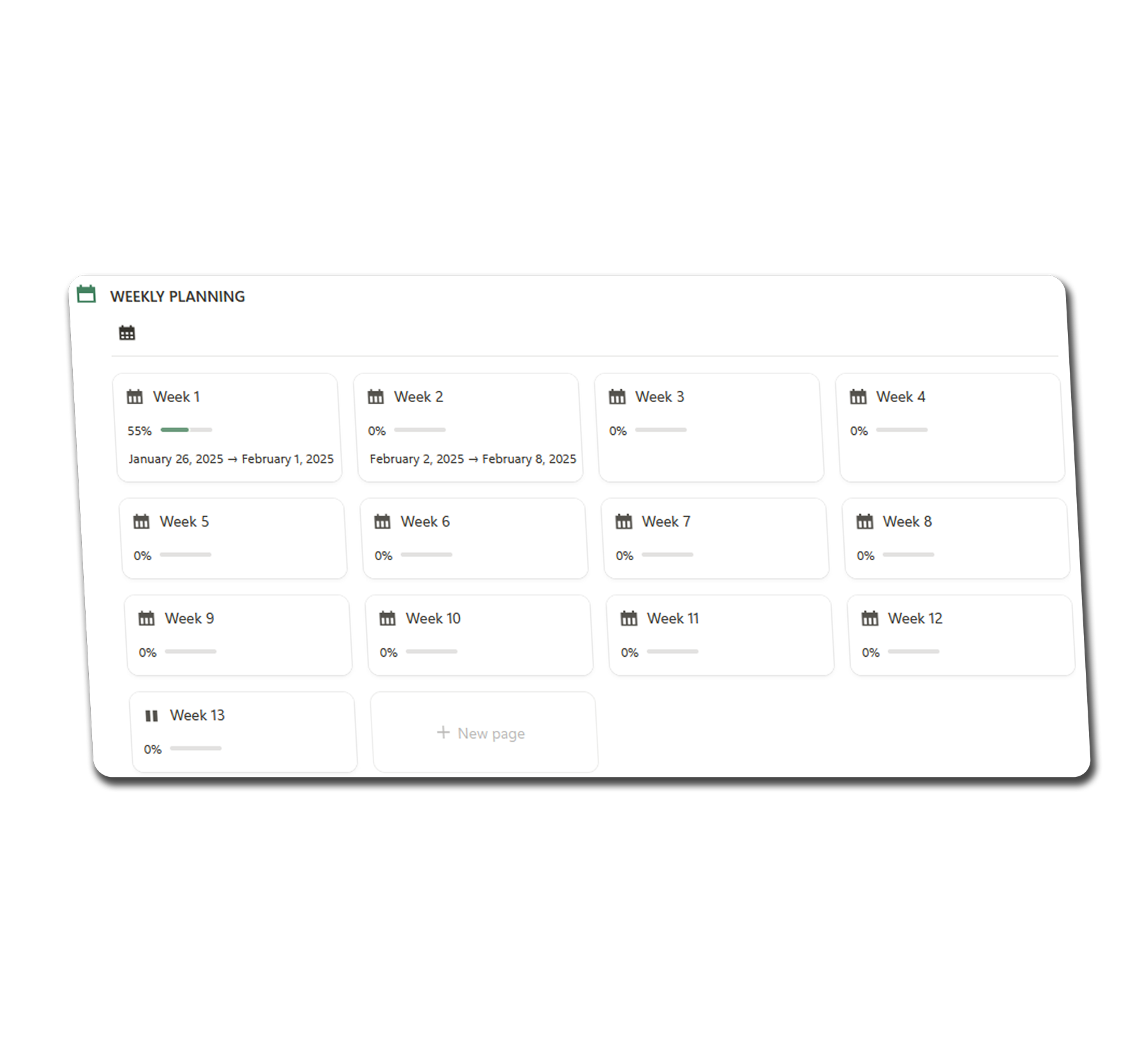 The 12-Week Year Blueprint is a Notion-based system designed to help you plan, execute, and track your goals using the powerful principles of The 12-Week Year. It includes goal-setting frameworks, weekly planning tools, progress tracking, and a guided reflection process to help you stay on track.