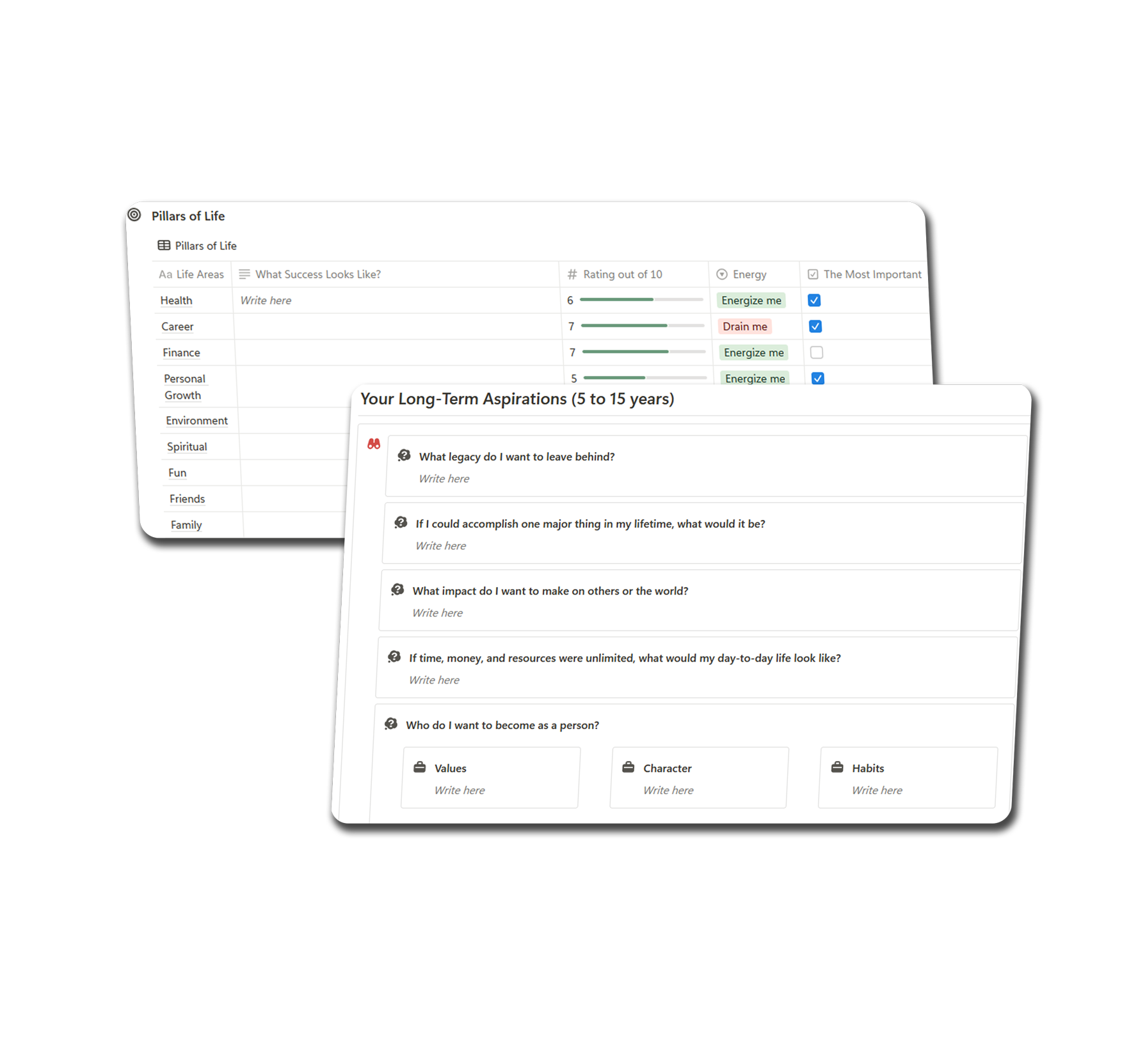 Assess every area of your life, define your long-term vision, and set mid-term and short-term goals with precision.