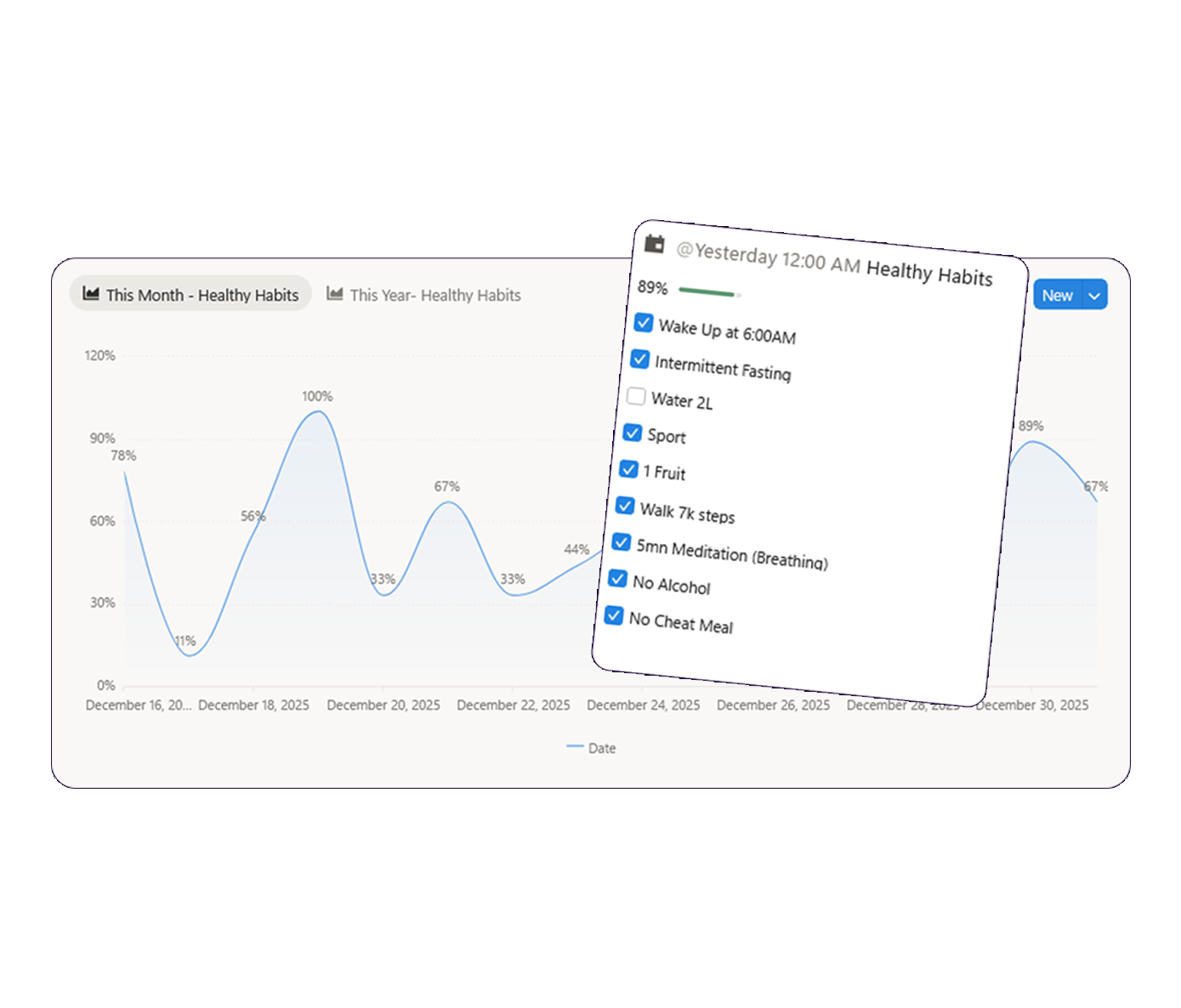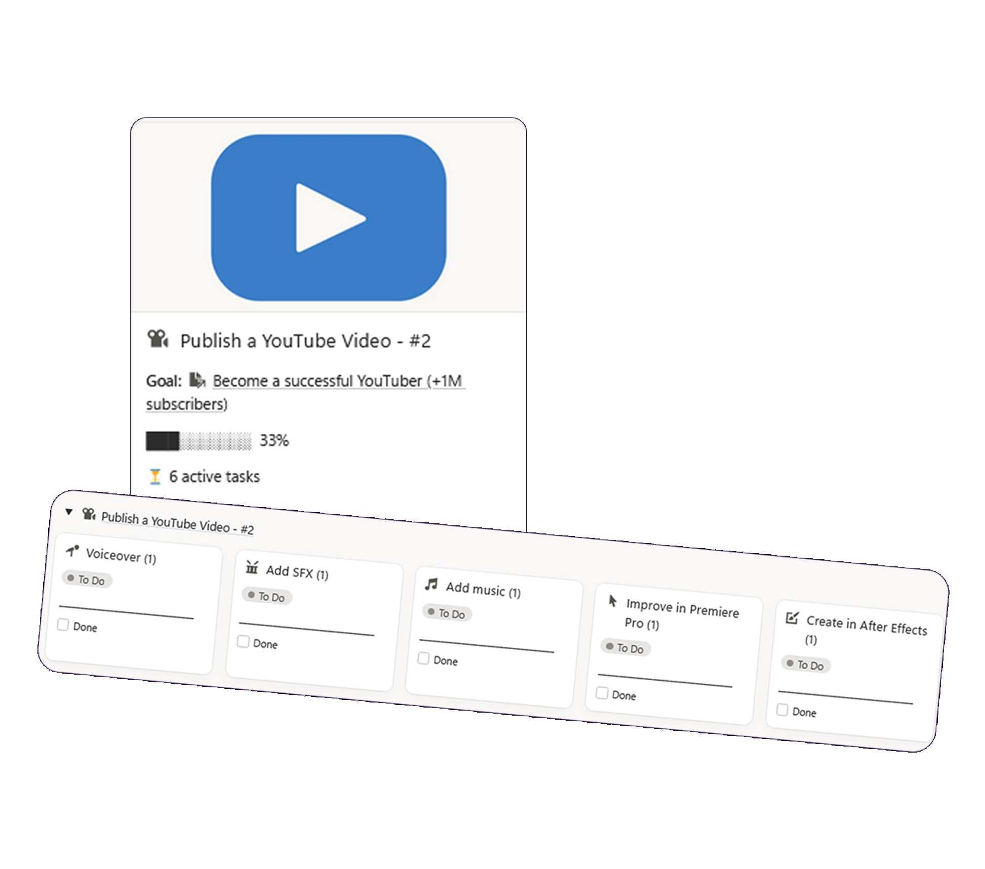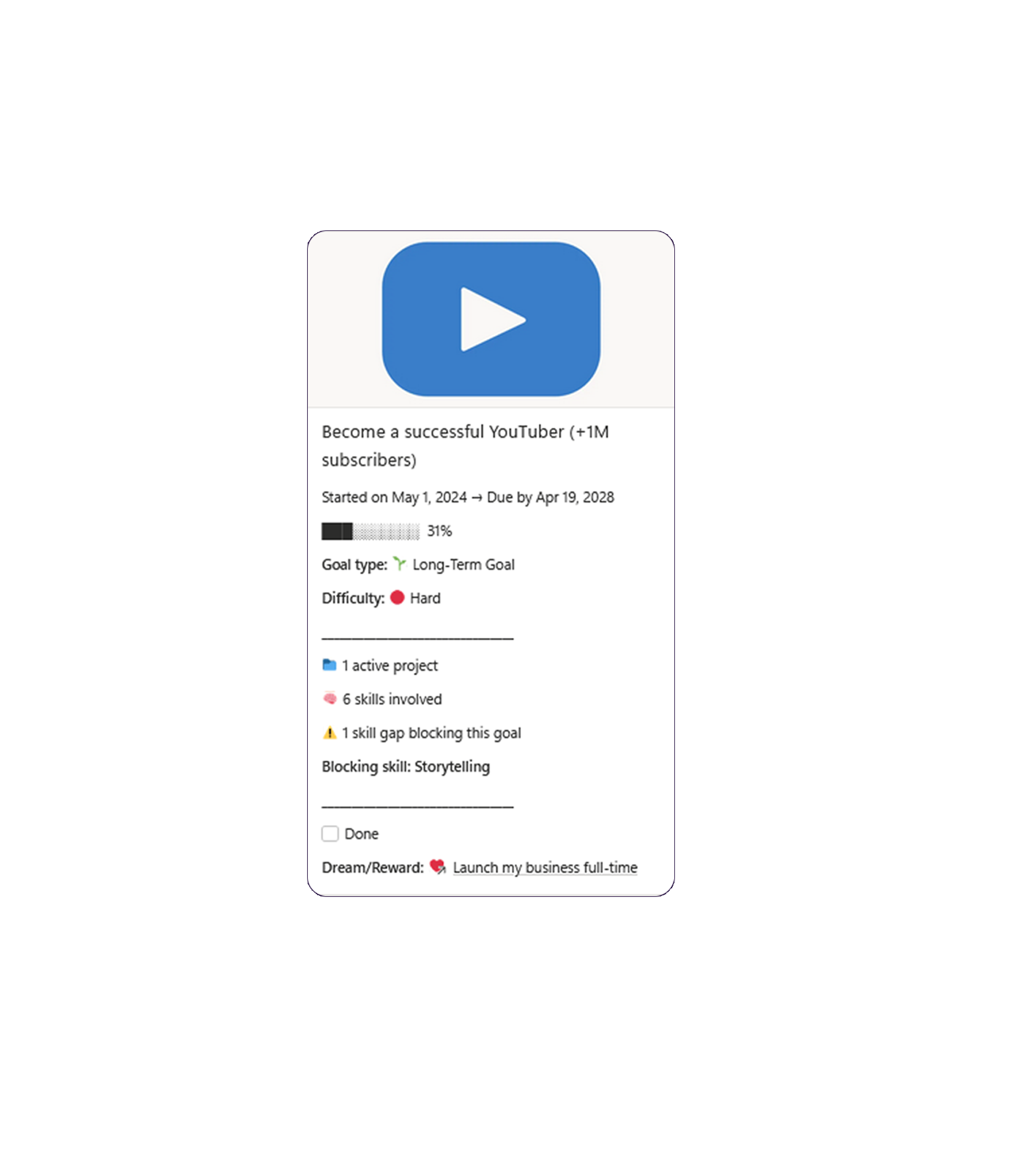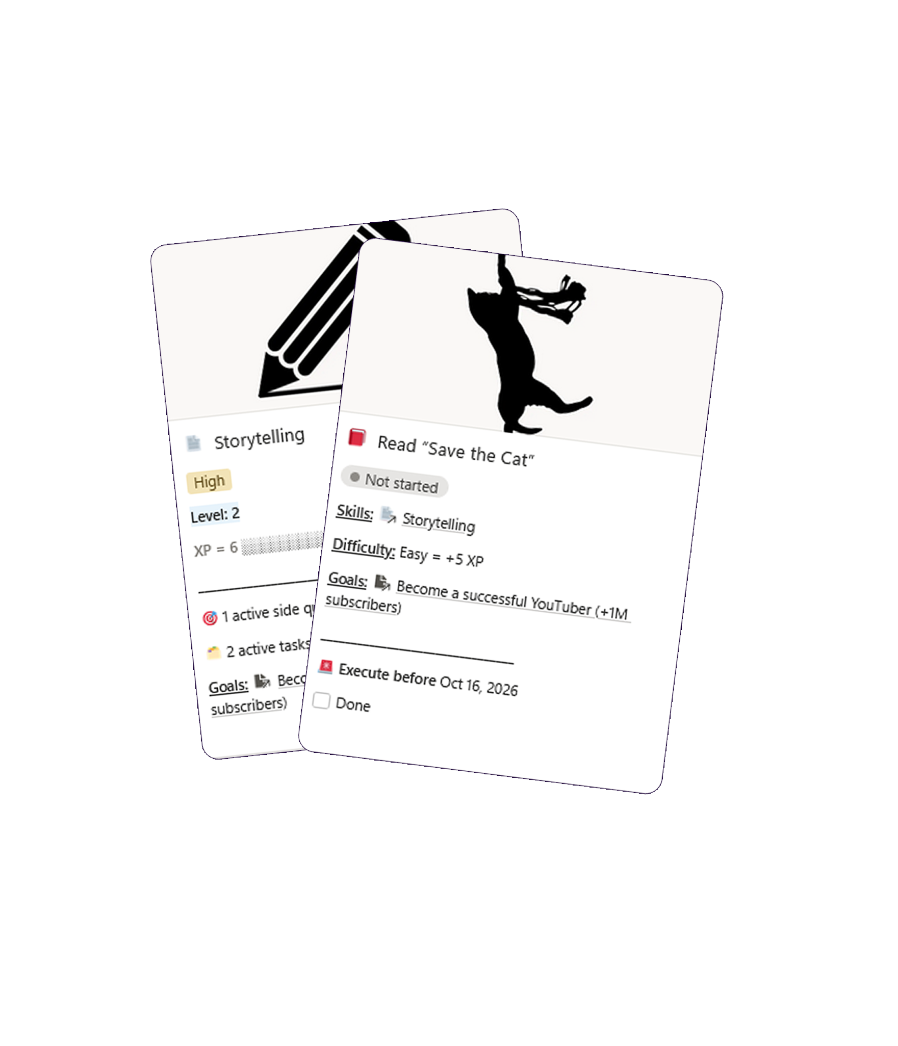 Goals, tasks, habits, skills, side quests, and reviews are all connected so your actions stay aligned with your identity and life balance, not just checklists.