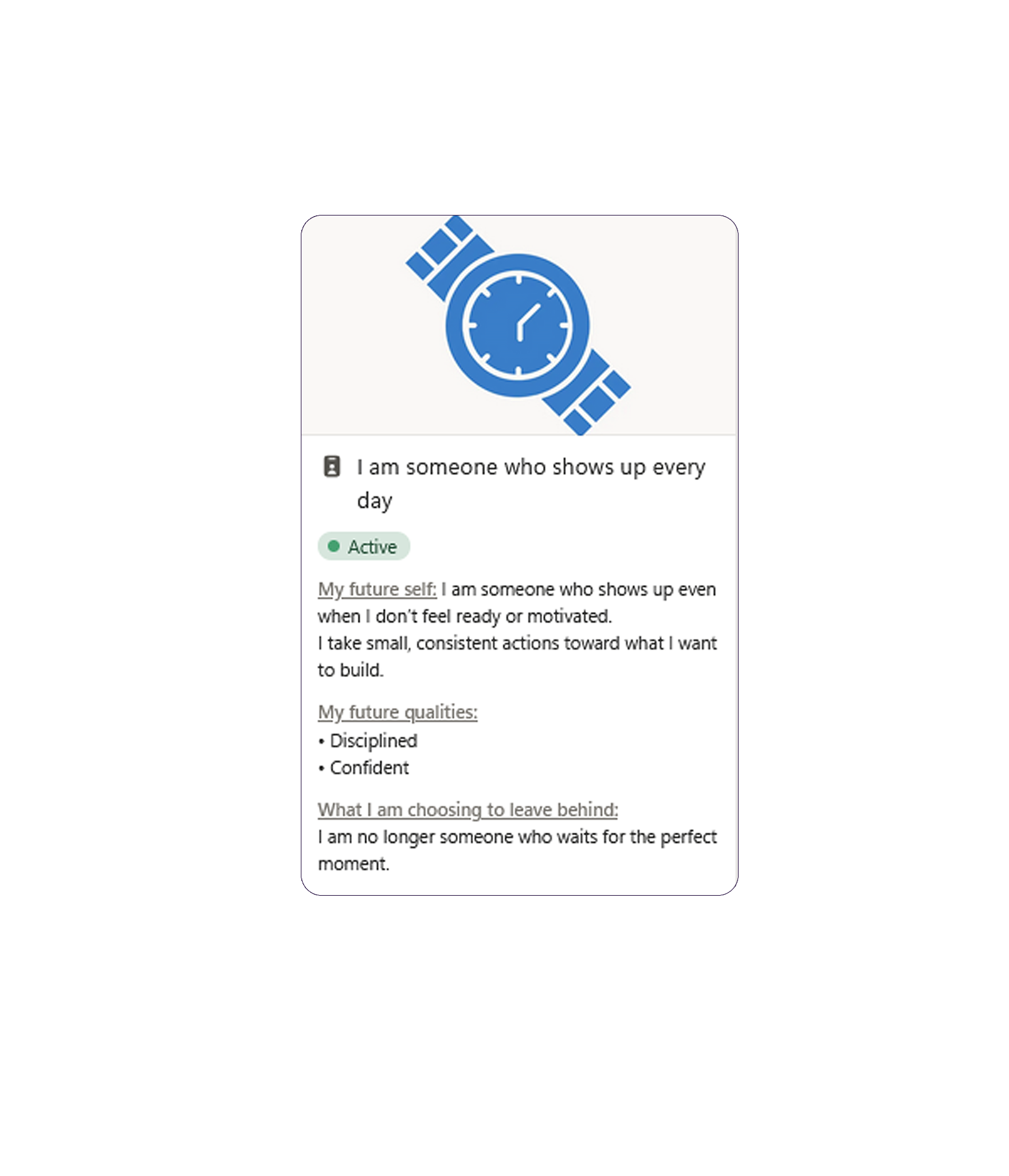 When actions align with your self-beliefs, consistency feels natural. You’re not forcing behavior for a distant result, you’re acting in line with who you see yourself as.